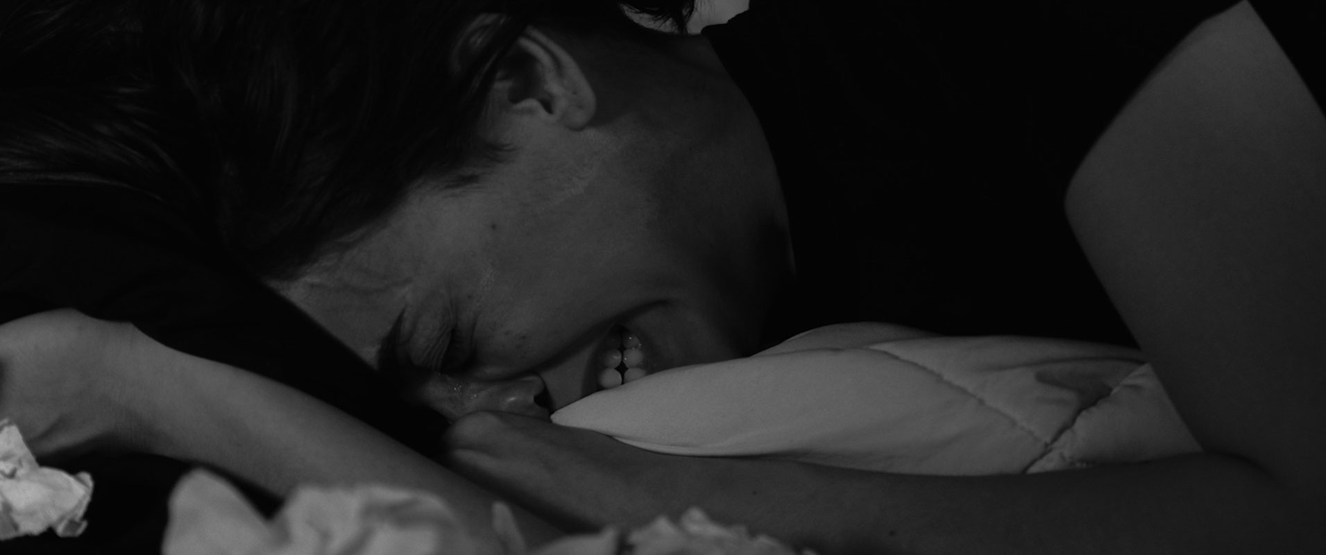 But, this short, sharp, shocking film is ripped from Simmons’ own experiences of night terrors and sleepwalking. Small surprise then that it has the texture of a fever dream as it unfolds. Although shot in start black and white, this is a grey, slippery beast, with power shifting between the spiralling Parker and her brittle therapist as they journey deeper into the shadows.